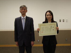最優秀賞の美濃口 紀子(熊本市都市政策研究所)様への賞状授与